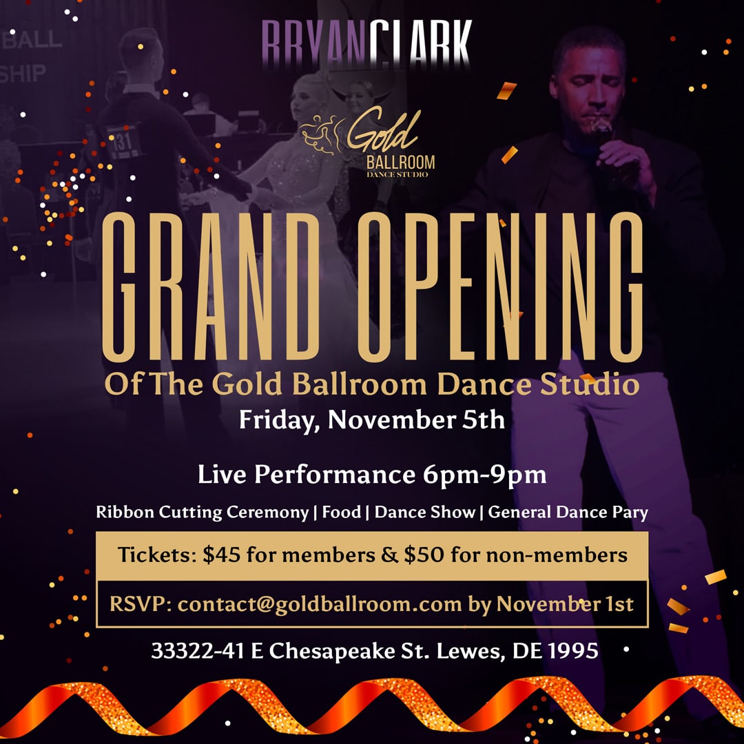 Please join me at the Gold Ballroom Dance Studio’s Grand Opening Friday, November 5th. In addition to music, there will be a ribbon-cutting ceremony, a dance show, and a general dance party.